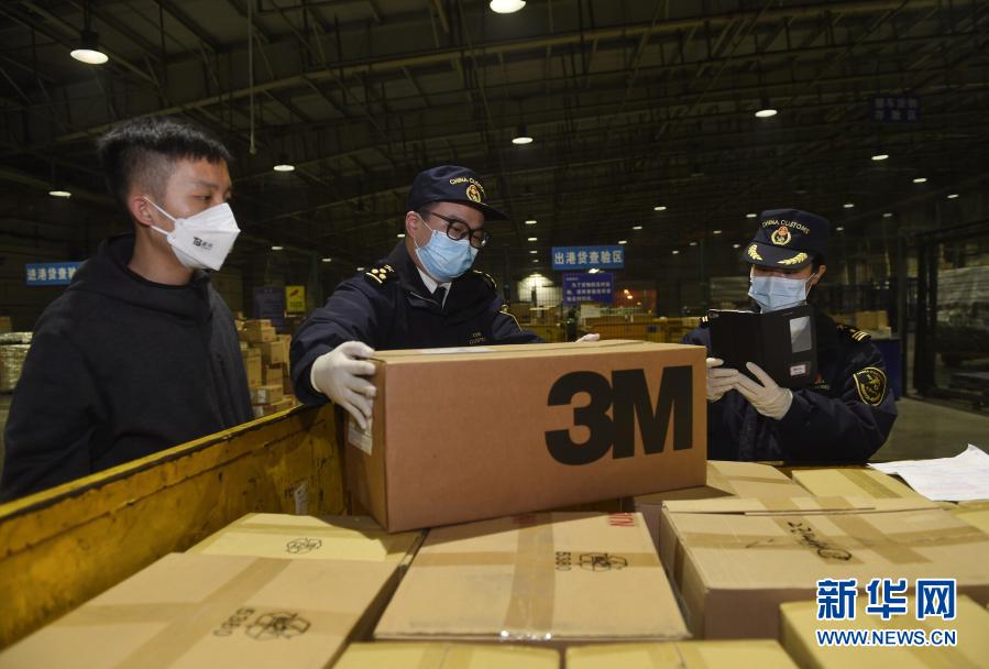 抗擊新冠疫情期間,成都海關關員在雙流機場口岸查驗防護物資,做到即到即提,實現疫情物資通關“零延時”(1月30日攝)。新華社記者 劉坤 攝