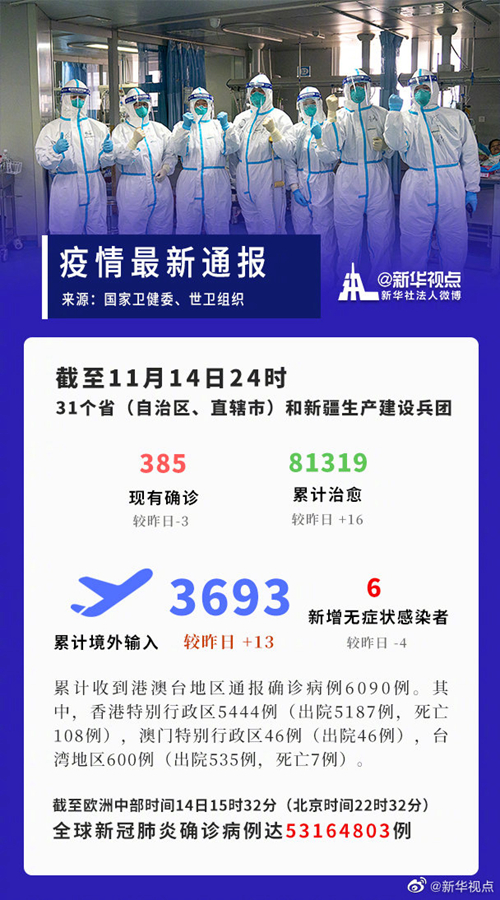 截至11月14日24時,據(jù)31個省(自治區(qū)、直轄市)和新疆生產(chǎn)建設(shè)兵團報告,現(xiàn)有確診病例385例(其中重癥病例4例),累計治愈出院病例81319例,累計死亡病例4634例,累計報告確診病例86338例,現(xiàn)有疑似病例2例。累計追蹤到密切接觸者873191人,尚在醫(yī)學(xué)觀察的密切接觸者15032人。