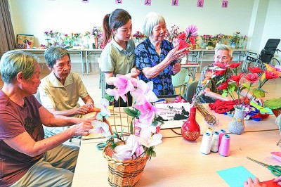 江蘇無錫市濱湖區社會福利中心活動室,志愿者與老人一起制作手工絲網花。新華社發