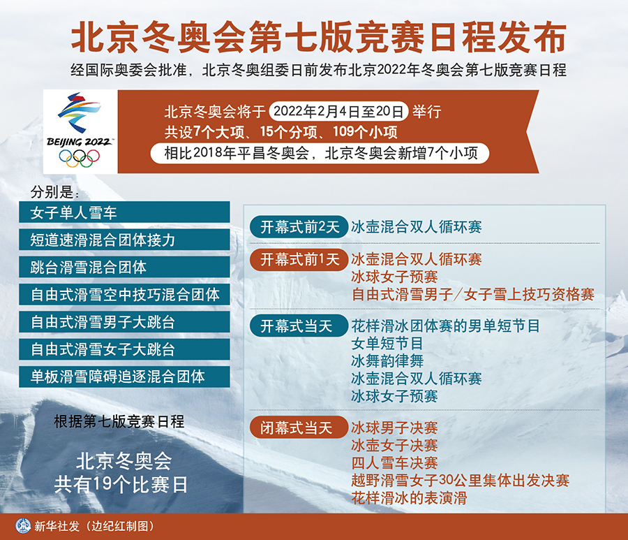 北京冬奧會(huì)將于2022年2月4日至20日舉行,共設(shè)7個(gè)大項(xiàng)、15個(gè)分項(xiàng)、109個(gè)小項(xiàng)。相比2018年平昌冬奧會(huì),北京冬奧會(huì)新增7個(gè)小項(xiàng),分別是:女子單人雪車、短道速滑混合團(tuán)體接力、跳臺(tái)滑雪混合團(tuán)體、自由式滑雪空中技巧混合團(tuán)體、自由式滑雪男子大跳臺(tái)、自由式滑雪女子大跳臺(tái)和單板滑雪障礙追逐混合團(tuán)體。