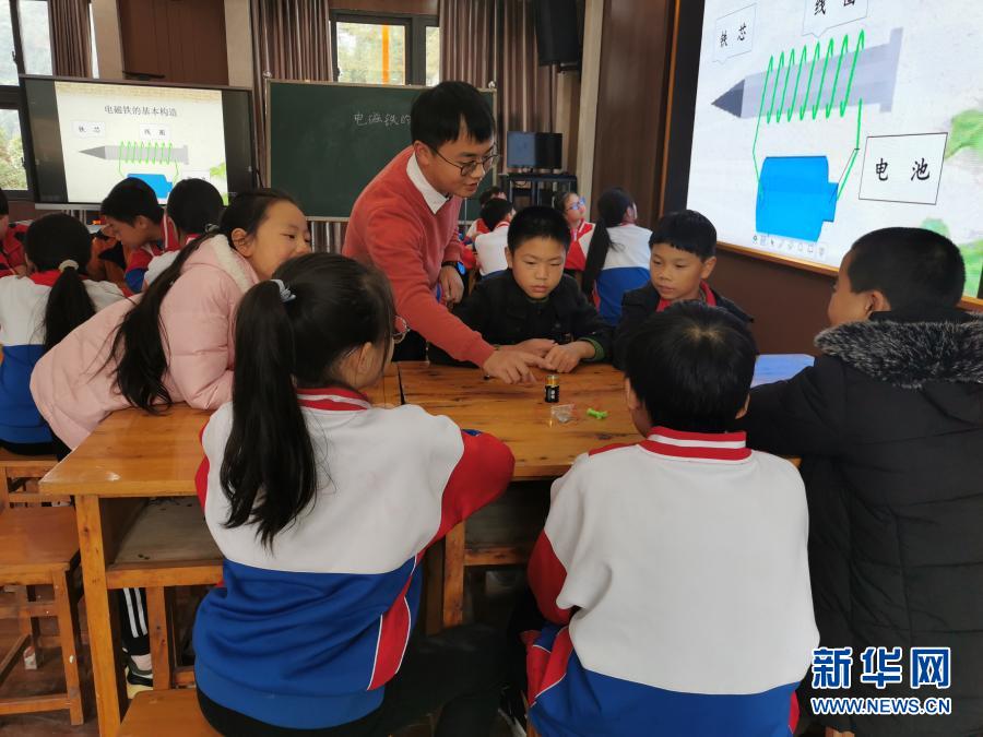 在重慶市石柱土家族自治縣中益鄉小學,唐大鵬(中)給孩子們上科學課(10月20日攝)。新華社發(劉婷 攝)
