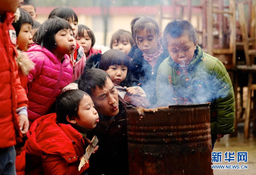 在江西省鷹潭市余江區春濤鎮黃泥村黃泥小學,老師章站亮(前右)和學生們一起生火(2019年1月3日攝)。由于生火用的材料均是廢棄的桌椅或者枯葉,點火后得不停用嘴吹氣才能燒得旺盛。新華社記者 胡晨歡 攝