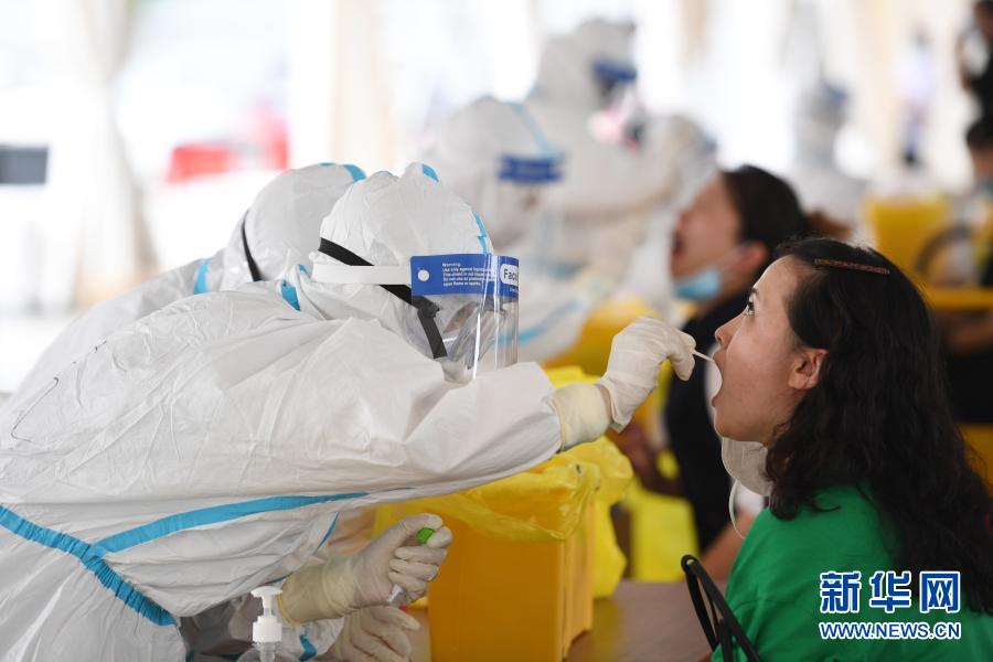 醫(yī)護(hù)人員在大連市人民路小學(xué)核酸檢測采樣點為市民采集咽拭子(7月27日攝)。新華社記者 龍雷 攝