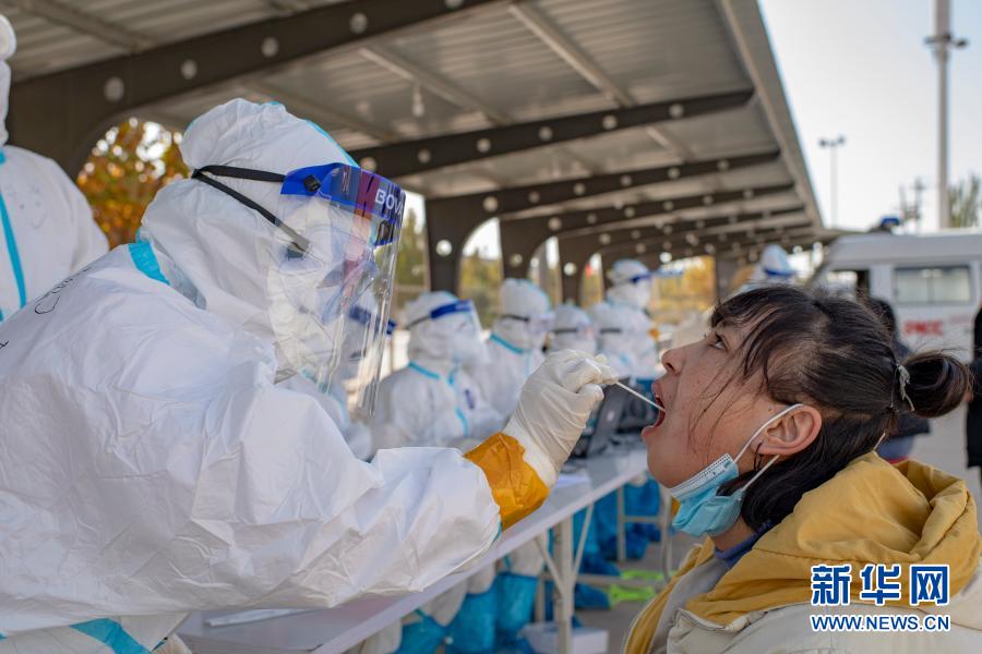 在新疆喀什地區(qū)疏附縣,醫(yī)護(hù)人員為居民采集咽拭子(10月26日攝)。新華社記者 胡虎虎 攝