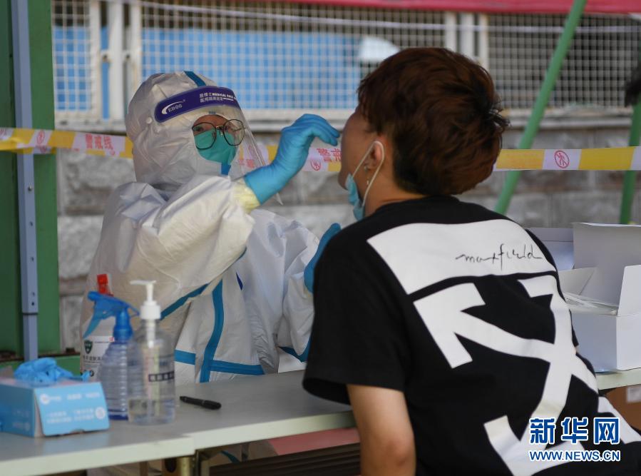在北京市西城區(qū)北京展覽館南側(cè)的露天廣場核酸檢測采樣點,醫(yī)護(hù)人員為前來做檢測的人員進(jìn)行采樣(6月28日攝)。新華社記者 鞠煥宗 攝