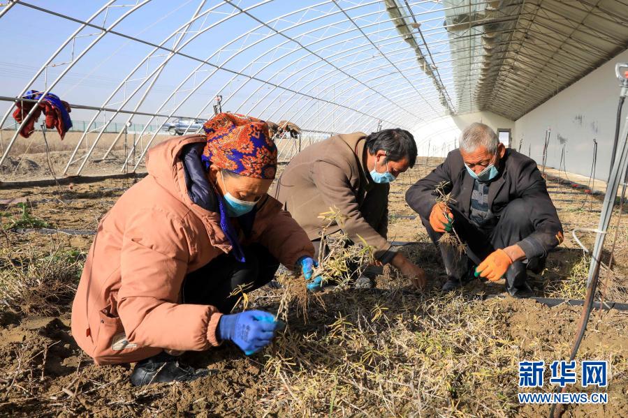 在新疆阿克蘇地區烏什縣阿合雅鎮吐曼村沙棘苗圃基地,員工在培育苗圃(11月7日攝)。新華社記者 張曼 攝