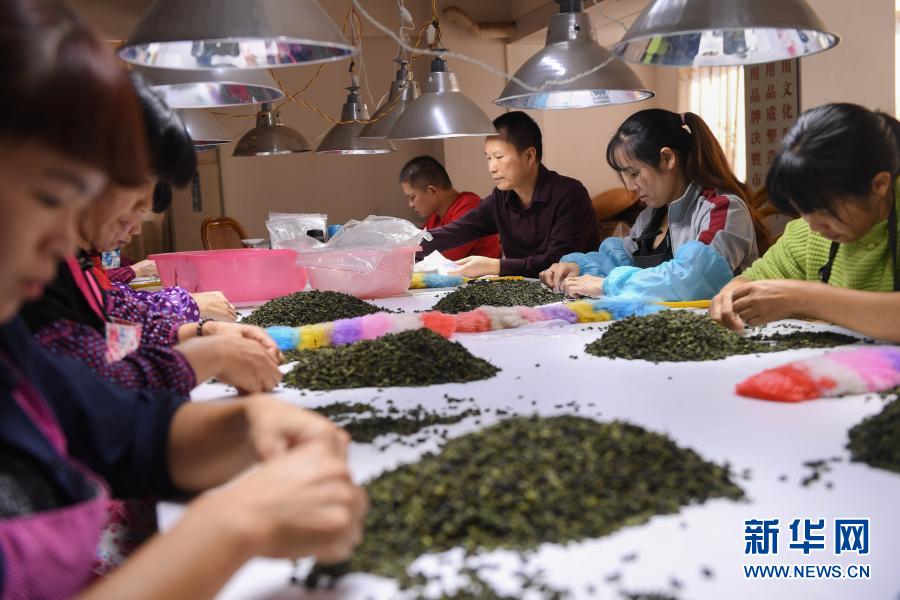 10月27日,在福建省安溪縣感德鎮槐川村的慶蕓茶葉專業合作社,合作社理事長陳慶云(右三)和工人在分揀鐵觀音茶葉。新華社記者 宋為偉 攝