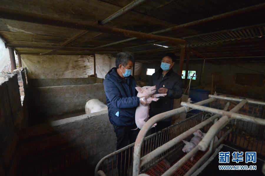 11月17日,范三林(左)與駐村扶貧工作隊隊長張亮亮檢查仔豬生長狀況。新華社記者 范世輝 攝