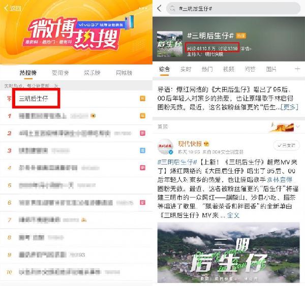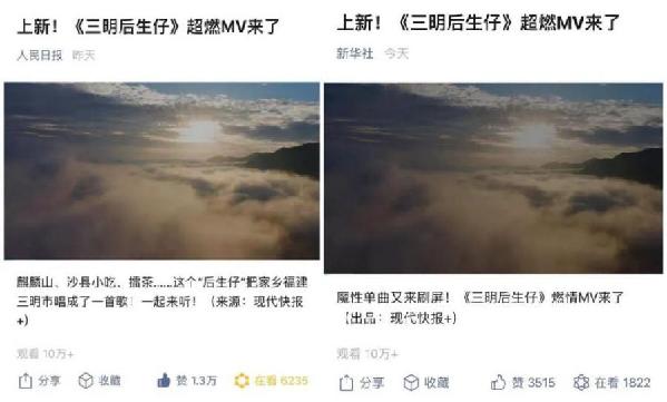 《三明后生仔》MV上線后,被人民日報、新華社、央視新聞、光明日報等多家媒體轉載,其中,人民日報、新華社微信公號均單篇推送,閱讀量很快超10萬+。在新浪微博、抖音、B站等多個平臺圈粉無數,還被福建日報、東南衛視、福州日報等多家當地媒體積極轉發。其中,學習強國平臺在首頁“這里是三明”板塊重點推薦。新浪微博話題#三明后生仔#閱讀量超4810萬,登上微博熱搜榜,數據還在持續攀升。