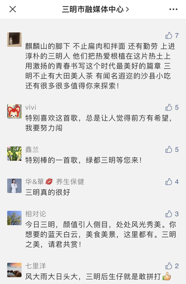 “我大福建真是處處美得沒話說!”“哈哈,我大沙縣又壓軸了。”“太好聽了!內心充滿自豪!”“開門見綠,抬頭見藍,這就是我的家鄉?!边€有網友希望這首歌“能上春晚”。更有網友吟誦起三明,“好山好水好風情,數一數二數三明。紅軍長征出發地,客家文化傳世界 …… ”