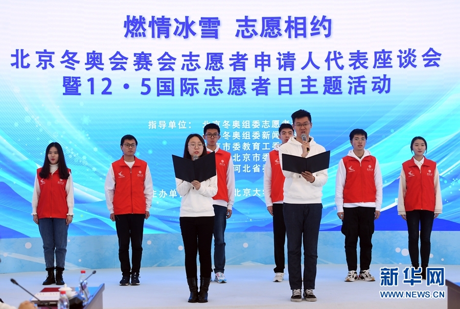 12月5日,北京大學(xué)青年志愿者在活動中宣讀《北京冬奧會賽會志愿者申請人倡議書》。新華社記者 任超 攝