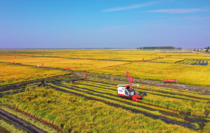 9月27日,農(nóng)民操作機械在興安盟袁隆平院士工作站鹽堿地水稻基地收獲水稻 徐欽攝 / 本刊