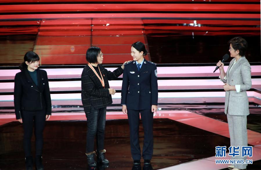張桂梅(左二)在“時代楷?!卑l(fā)布儀式上介紹自己的兩名學生(12月7日攝)。新華社記者 潘旭 攝