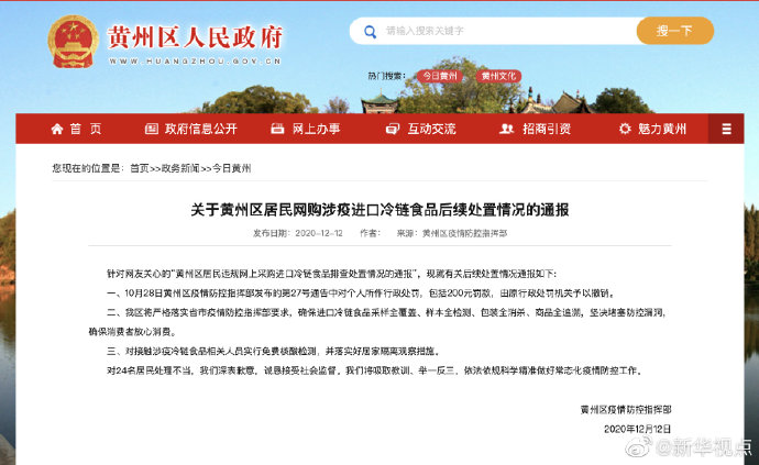 湖北省黃岡市黃州區(qū)人民政府網(wǎng)站12日發(fā)布通報(bào),撤銷對網(wǎng)購涉疫進(jìn)口冷鏈?zhǔn)称穫€(gè)人所作的行政處罰,包括200元罰款。 ????