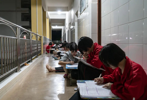 子夜時分,華坪女高的宿舍樓樓道內燈火通明,學生在樓道里支起小桌,席地而坐,老師在樓道內來回巡視,為學生答疑解惑。