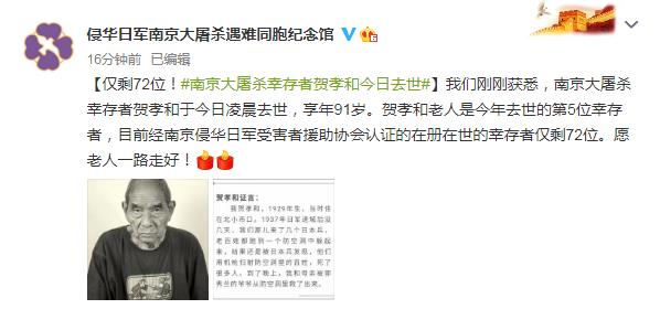 據侵華日軍南京大屠殺遇難同胞紀念館官方微博消息,南京大屠殺幸存者賀孝和于今日凌晨去世,享年91歲。賀孝和老人是今年去世的第5位幸存者,目前經南京侵華日軍受害者援助協會認證的在冊在世的幸存者僅剩72位。