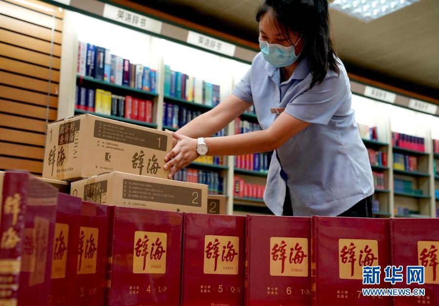 上海書城工作人員將《辭海》(第七版)擺放上架(9月10日攝)。新華社記者 劉穎 攝