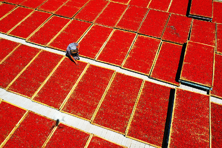 ????2020年7月19日,甘肅省張掖市高臺縣黑泉鎮十壩村,當地農民正在戈壁灘上晾曬成熟的枸杞。鄭耀德 攝