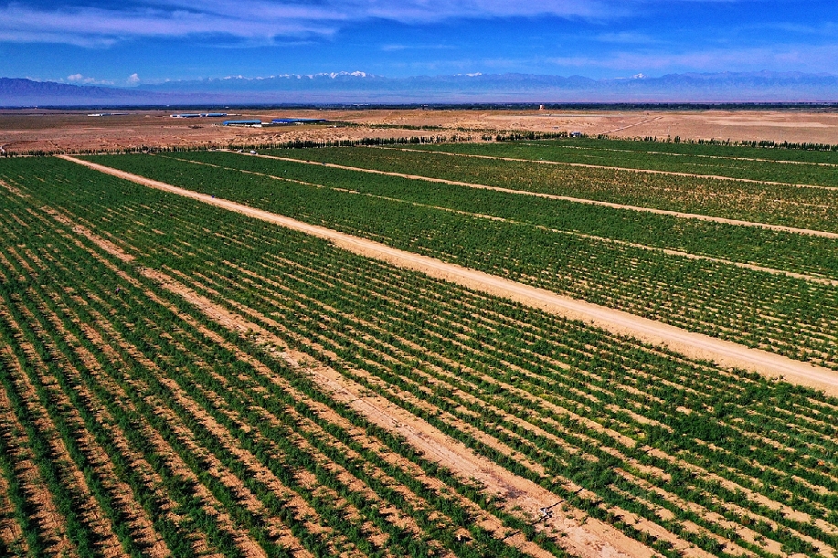????2020年7月19日,在甘肅省張掖市高臺縣黑泉鎮十壩村戈壁灘上,一眼望不到邊的枸杞種植基地,在祁連雪山的映襯下顯得蔚為壯觀。鄭耀德 攝