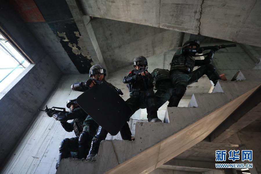 武警新疆總隊某機動支隊特戰一中隊開展模擬街區捕殲演練(9月20日攝)。新華社發 (張文 攝)