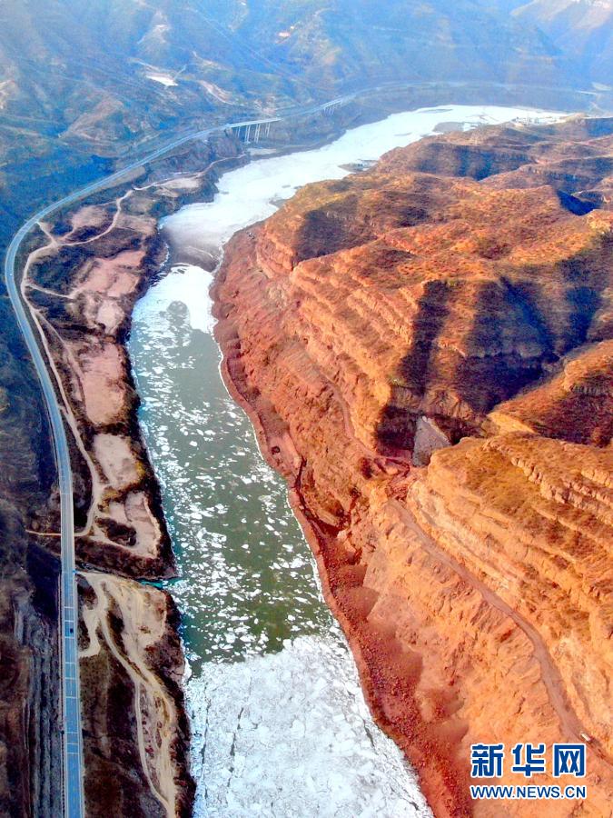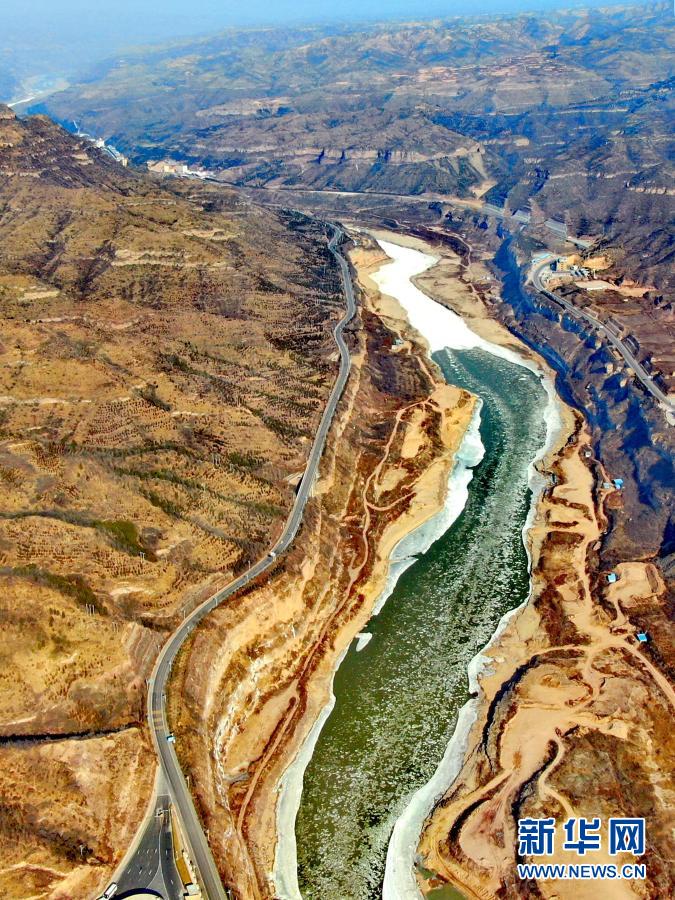 壺口瀑布至龍門(mén)水文站之間的黃河(12月26日攝,無(wú)人機(jī)照片)。新華社記者 劉詩(shī)平 攝