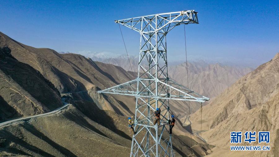 2020年4月28日,在新疆葉城縣南部山區海拔3100多米的阿卡孜達坂上,工人登上鐵塔檢修零部件,為放線做準備(無人機照片)。