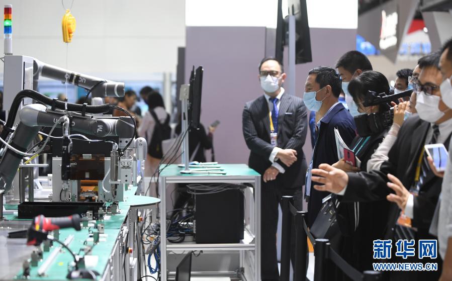 2020年11月6日,在進博會技術(shù)裝備展區(qū),人們在西門子展臺觀看人機協(xié)作的智能化單元生產(chǎn)線。新華社記者 李任滋 攝
