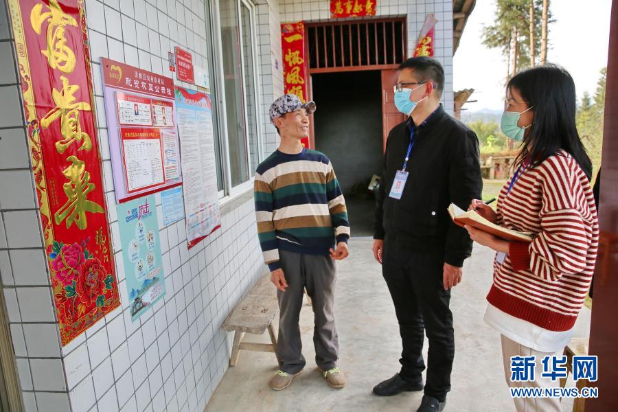 紀檢監察干部向四川洪雅縣中山鎮鄒崗村建檔立卡貧困戶楊德彬(左一)核實產業扶貧資金落實情況(2020年3月18日攝)。新華社記者 江宏景 攝