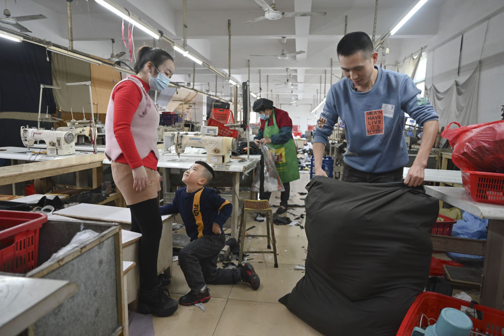 1月26日,在福建省石獅市的金利萊斯服裝廠,聰聰和黃海龍在一起。