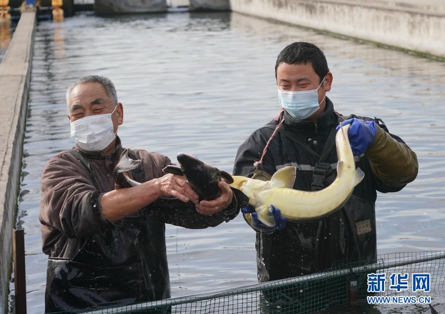 2月4日,河北省井陘縣上坡頭村綠野漁業(yè)養(yǎng)殖合作社社員展示剛捕撈的鱘魚。新華社記者 楊世堯 攝