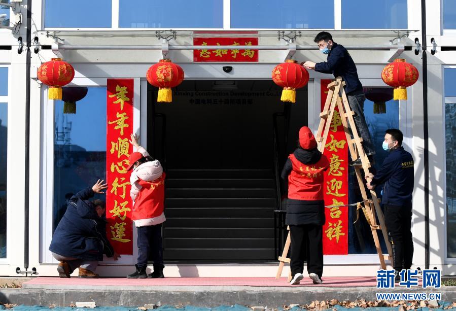 2月6日,在河北省石家莊市橋西區(qū)一處工地項目部,志愿者與工人們一起掛燈籠。新華社記者 王曉 攝