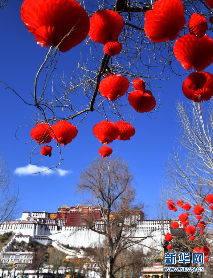 2月8日拍攝的拉薩布達拉宮前的紅燈籠。新華社記者 覺果 攝