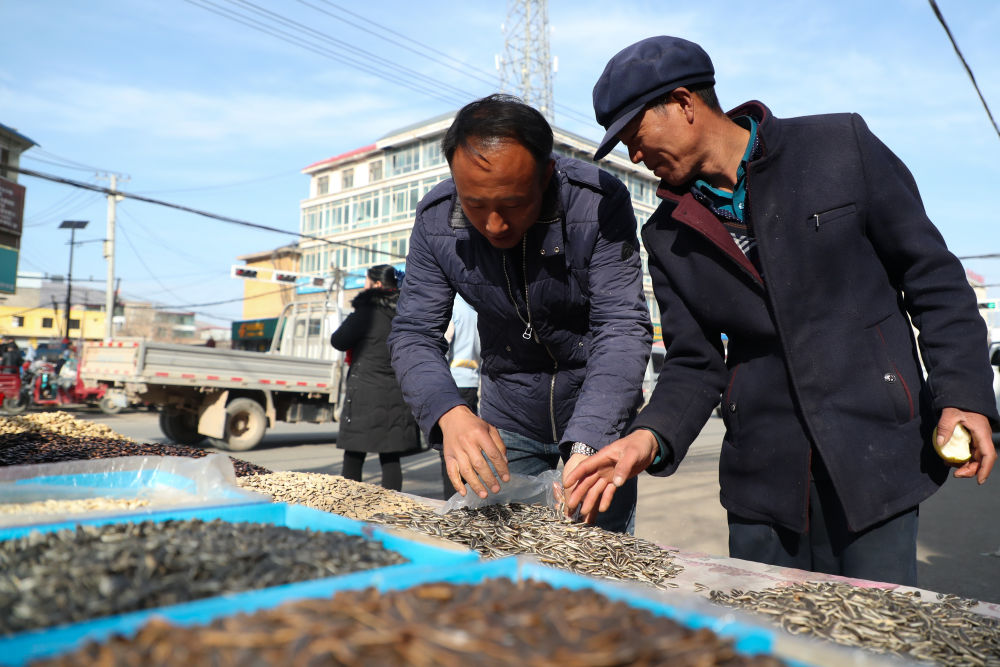 2月7日,在甘肅省定西市渭源縣會川鎮集市上,元古堆村村民曾玉成(右)在置辦年貨。新華社記者 馬希平 攝
