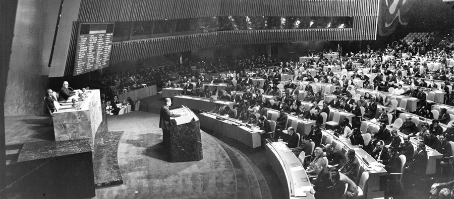 1971年9月,第二十六屆聯(lián)合國(guó)大會(huì)召開。從10月18日開始,聯(lián)合國(guó)大會(huì)就恢復(fù)中華人民共和國(guó)在聯(lián)合國(guó)的代表權(quán)問(wèn)題進(jìn)行了一周的激烈辯論。10月25日,第二十六屆聯(lián)合國(guó)大會(huì)表決剛一結(jié)束,紐約聯(lián)合國(guó)會(huì)議大廳里立刻一片沸騰,雷鳴般的掌聲和歡呼聲一浪高過(guò)一浪,此起彼伏,經(jīng)久不息。新聞媒介評(píng)論道:“中國(guó)是在自己不在場(chǎng)的情況下,受到聯(lián)大三分之二以上國(guó)家的祝福,使聯(lián)合國(guó)發(fā)生根本變化。”
