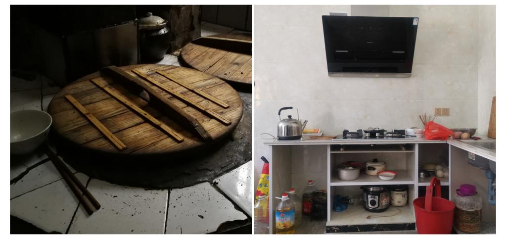 拼版照片:左圖為2017年8月29日,記者在一戶農(nóng)家中拍攝的土灶臺。