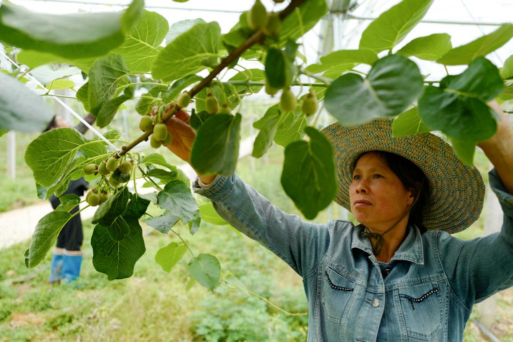 圖為長坪村村民在獼猴桃種植大棚內進行疏果作業。(新華社記者劉潺 攝)