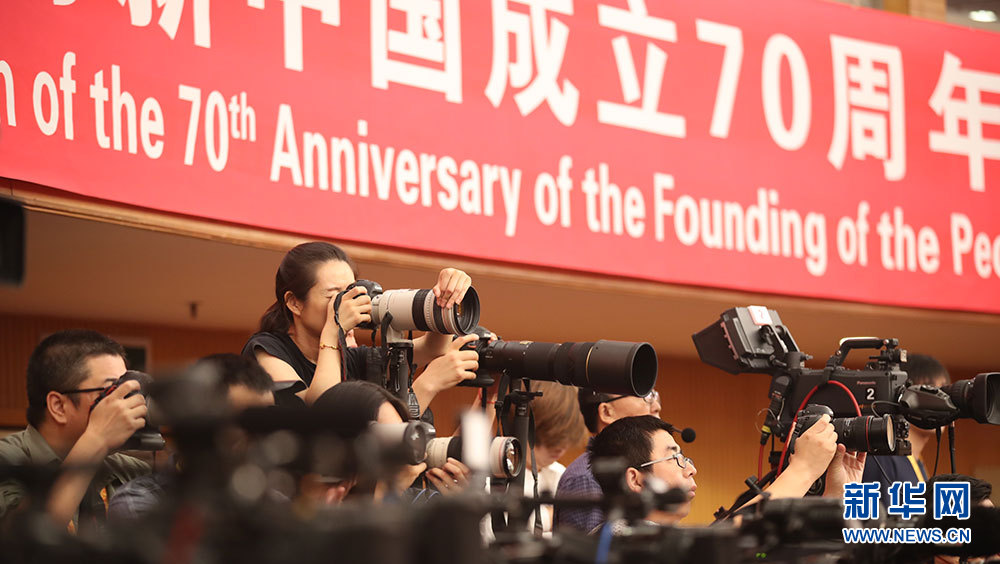 9月24日,慶祝中華人民共和國成立70周年活動新聞中心在北京梅地亞中心二層新聞發布廳舉辦第一場新聞發布會。圖為采訪新聞發布會的媒體記者。新華網記者 陳競超 攝
