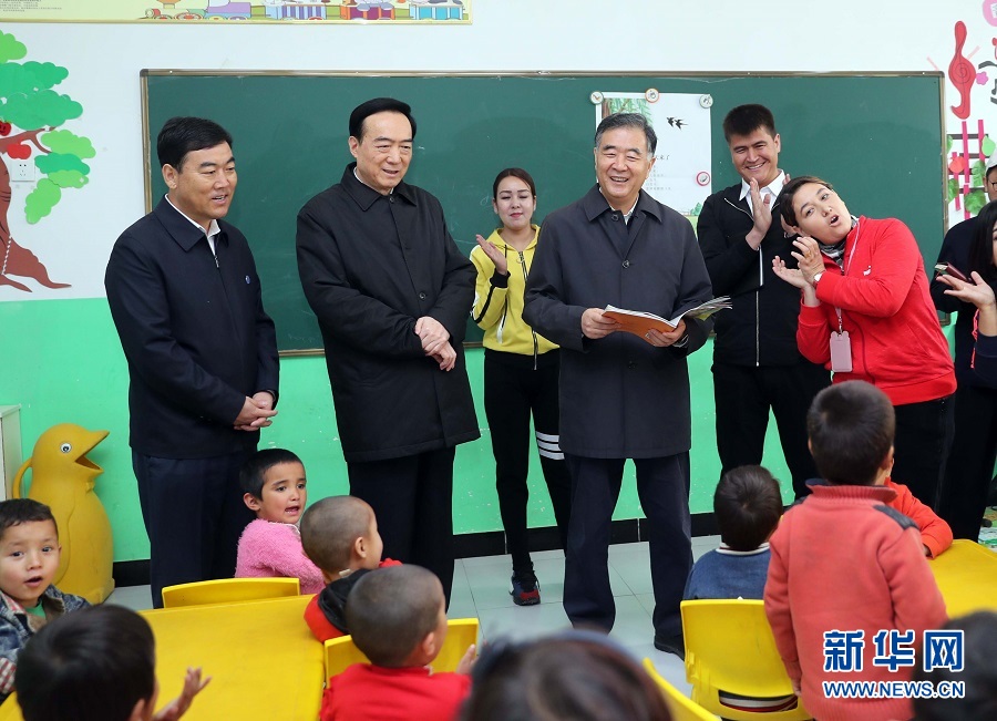 4月10日至14日,中共中央政治局常委、全國政協主席汪洋在新疆調研。這是4月11日,汪洋來到和田縣村里的幼兒園看望孩子。 新華社記者劉衛兵 攝