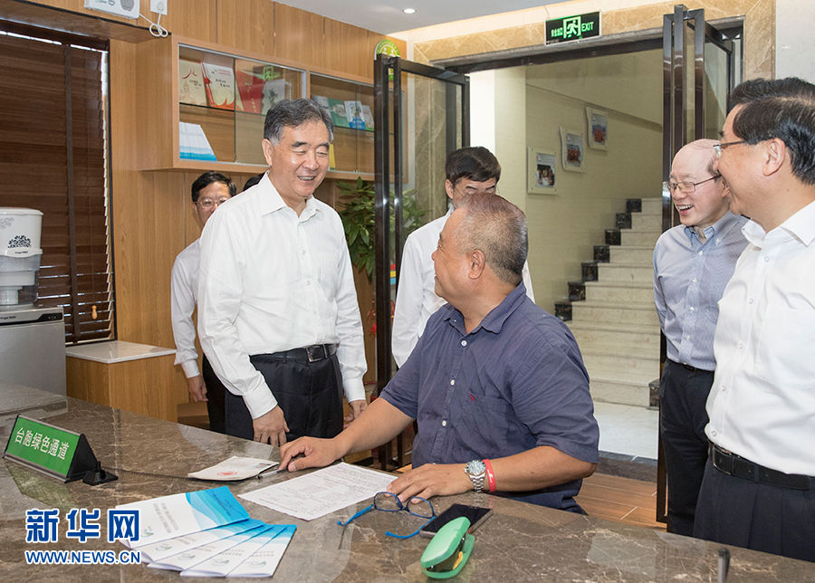 6月6日至7日,中共中央政治局常委、全國政協主席汪洋在廈門出席第十屆海峽論壇期間,就兩岸經濟文化交流合作情況進行調研。這是6月7日,汪洋在廈門市湖里區殿前街道興隆社區便民服務大廳了解臺胞在閩生活工作情況。新華社記者 王曄 攝