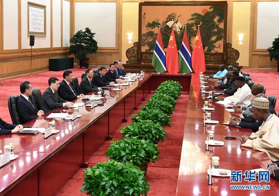 習近平歡迎岡比亞總統首次出席中非合作論壇會議,指出這對中岡關系、中非關系、論壇建設均具有重要意義。習近平強調,中岡復交2年多來,雙方友好合作全面、順利推進,雙邊關系發展得很好、很快,中方對兩國關系發展取得的成果感到滿意。中方贊賞總統先生和岡比亞政府堅持一個中國原則,愿同岡方繼續把握好兩國關系的大方向,不斷增進政治互信,繼續在涉及彼此核心利益和重大關切問題上相互堅定支持。中方支持岡比亞政府“建設新岡比亞”的努力,愿加強務實合作,擴大人文交流。中方支持岡方加強和平安全能力建設。