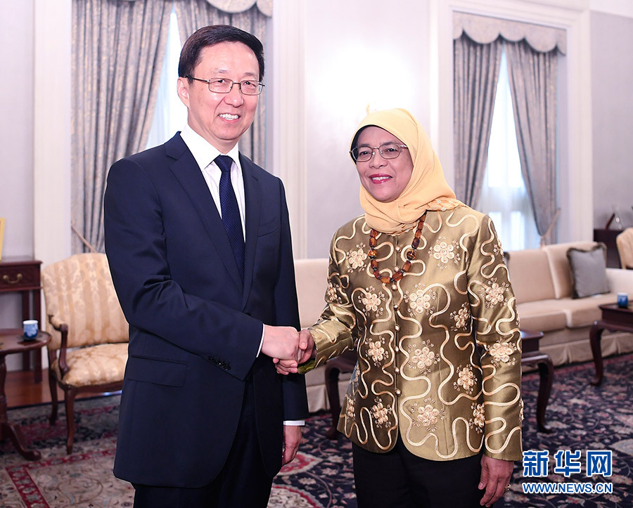 在同新方領(lǐng)導(dǎo)人會見時,韓正轉(zhuǎn)達(dá)了習(xí)近平主席、李克強總理對哈莉瑪總統(tǒng)、李顯龍總理的親切問候,哈莉瑪和李顯龍表示感謝并請韓正轉(zhuǎn)達(dá)他們對中國領(lǐng)導(dǎo)人的良好祝愿。