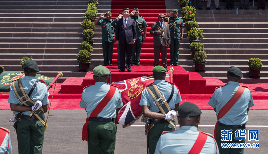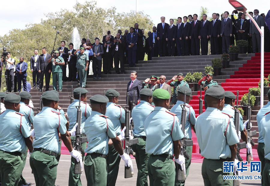 當(dāng)?shù)貢r(shí)間上午10時(shí)30分許,習(xí)近平乘車(chē)抵達(dá)議會(huì)大廈,受到達(dá)達(dá)埃熱情迎接。兩國(guó)領(lǐng)導(dǎo)人登上檢閱臺(tái)。軍樂(lè)隊(duì)奏中巴新兩國(guó)國(guó)歌。現(xiàn)場(chǎng)鳴21響禮炮。習(xí)近平在達(dá)達(dá)埃陪同下檢閱儀仗隊(duì)。檢閱畢,習(xí)近平同巴新方主要官員握手,達(dá)達(dá)埃同中方陪同人員握手。兩國(guó)領(lǐng)導(dǎo)人共同前往議會(huì)大廈會(huì)見(jiàn)廳,巴布亞新幾內(nèi)亞議長(zhǎng)波馬特等在大廈外迎接并陪同會(huì)見(jiàn)。