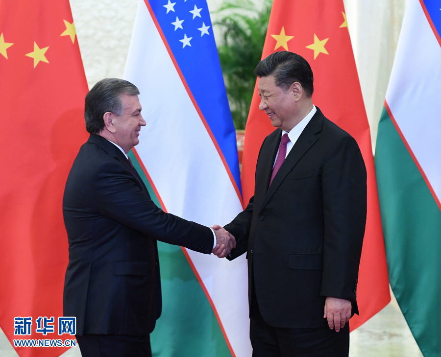 4月25日,國家主席習近平在北京人民大會堂會見烏茲別克斯坦總統米爾濟約耶夫。 新華社記者 殷博古 攝