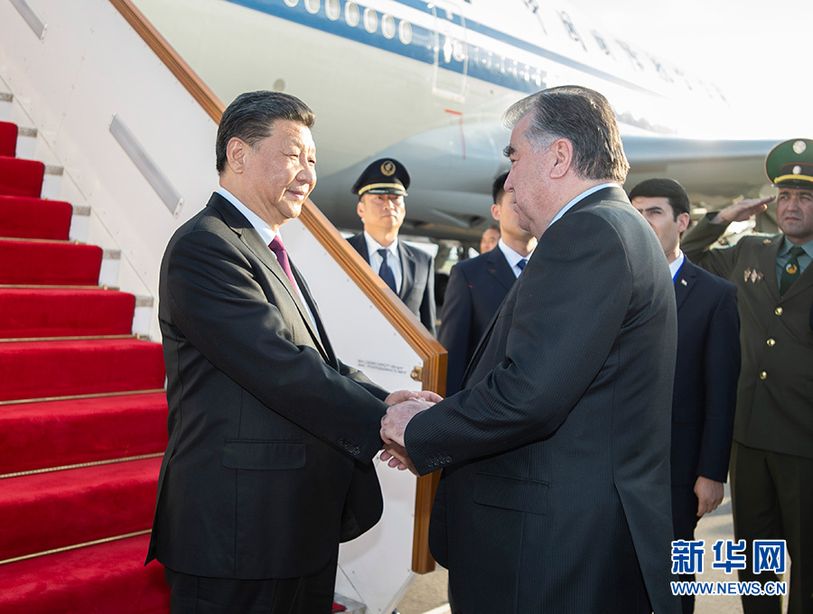 當地時間晚6時許,習近平乘坐的專機抵達杜尚別國際機場。習近平步出艙門,受到塔吉克斯坦總統拉赫蒙熱情迎接。塔吉克斯坦女青年向習近平獻花。禮兵分列紅地毯兩側。