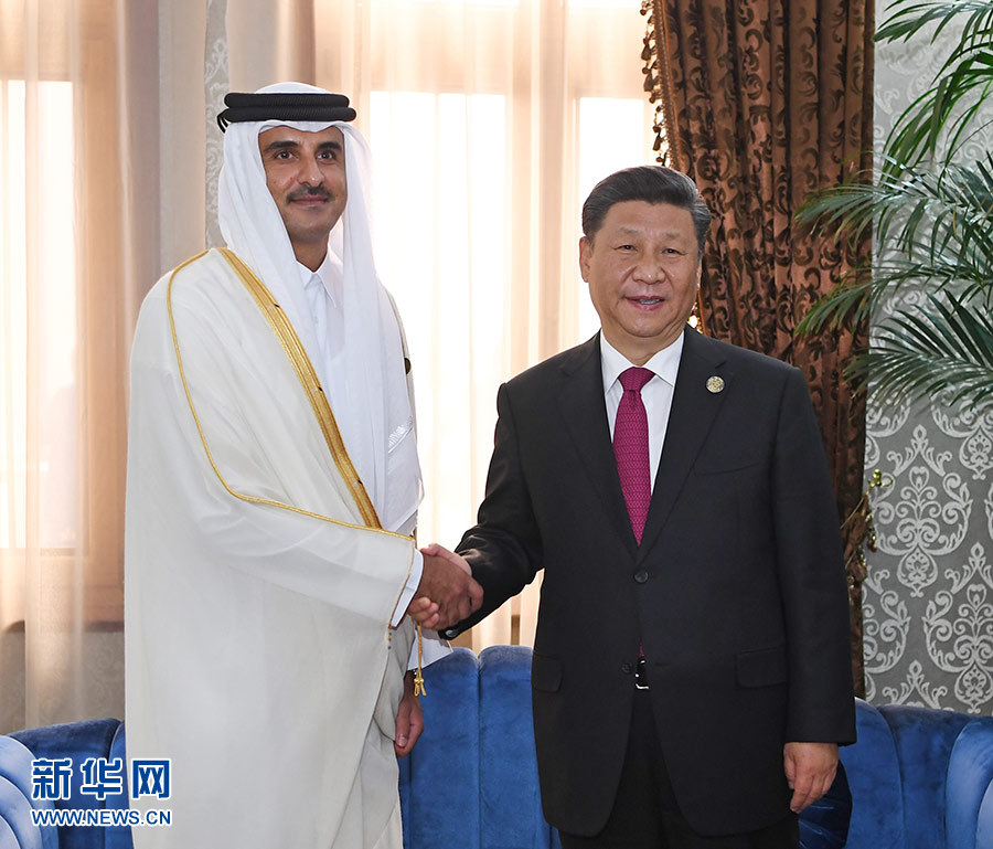6月15日,國家主席習近平在杜尚別會見卡塔爾埃米爾塔米姆。 新華社記者 王曄 攝