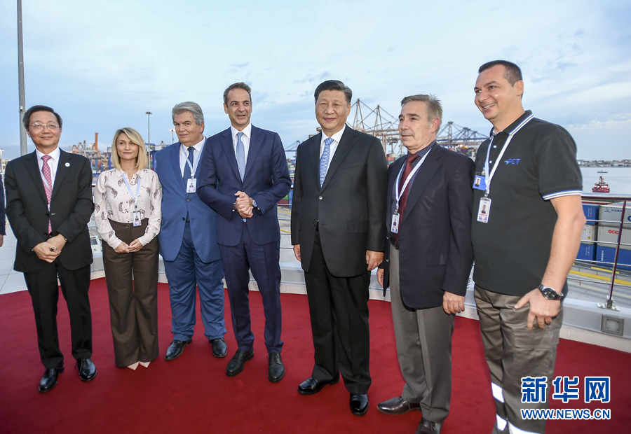 當(dāng)?shù)貢r(shí)間11月11日,國(guó)家主席習(xí)近平和夫人彭麗媛在希臘總理米佐塔基斯夫婦陪同下,共同參觀中遠(yuǎn)海運(yùn)比雷埃夫斯港項(xiàng)目。這是習(xí)近平夫婦和米佐塔基斯夫婦同中遠(yuǎn)當(dāng)?shù)貑T工等合影。 新華社記者 黃敬文 攝
