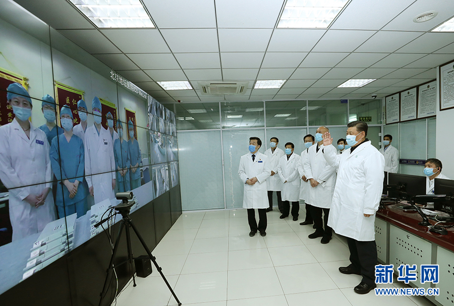 自今年1月12日起,首都醫科大學附屬北京地壇醫院開始承擔新冠肺炎患者的救治、篩查、隔離工作,收治了北京市第一例確診病例。習近平來到地壇醫院門診樓一層運行監控中心,通過監控畫面察看患者住院診療情況,并視頻連線正在病房值班的醫務人員,鼓勵他們繼續完善診療方案,繼續全力以赴救治患者,努力提高收治率和治愈率、降低感染率和病亡率,并叮囑他們做好自我防護。