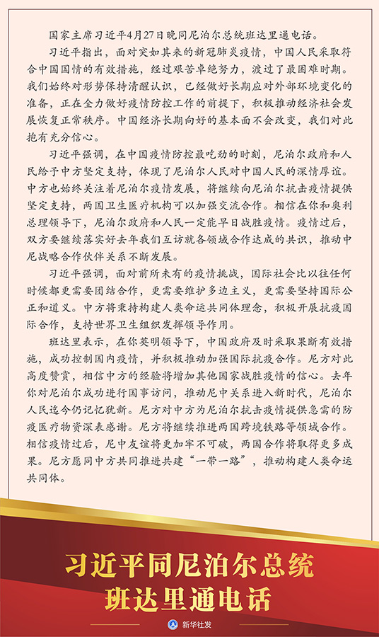 新華社北京4月27日電 國(guó)家主席習(xí)近平27日晚同尼泊爾總統(tǒng)班達(dá)里通電話。