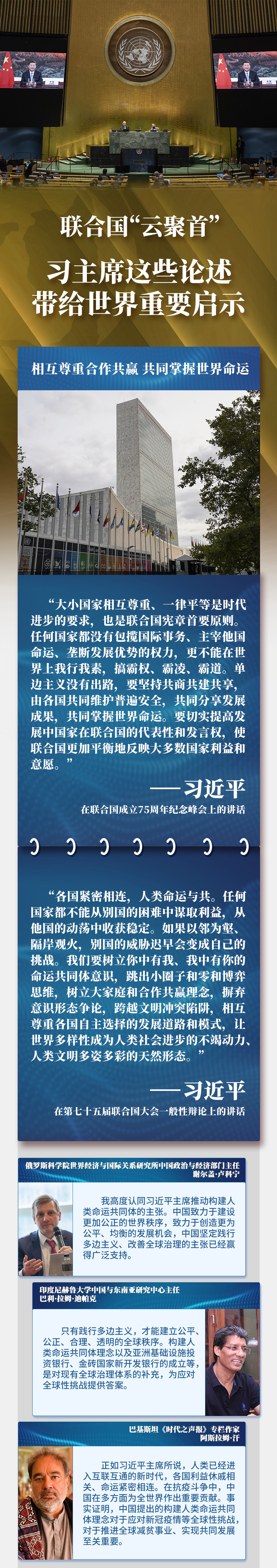 在聯(lián)合國(guó)成立75周年之際,習(xí)主席通過(guò)視頻方式,在聯(lián)合國(guó)這一多邊外交舞臺(tái)闡述關(guān)于國(guó)際秩序和人類(lèi)前途命運(yùn)的中國(guó)主張,為國(guó)際社會(huì)應(yīng)對(duì)全球性挑戰(zhàn)、推動(dòng)共同發(fā)展指明方向,為世界各國(guó)攜手構(gòu)建人類(lèi)命運(yùn)共同體、共創(chuàng)更加美好的未來(lái)注入信心和動(dòng)力——