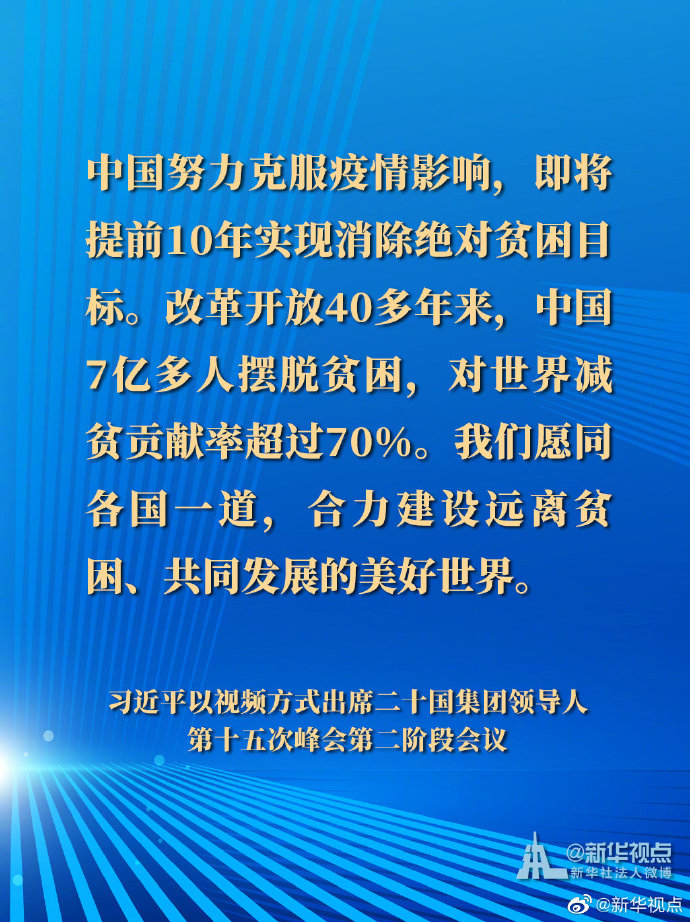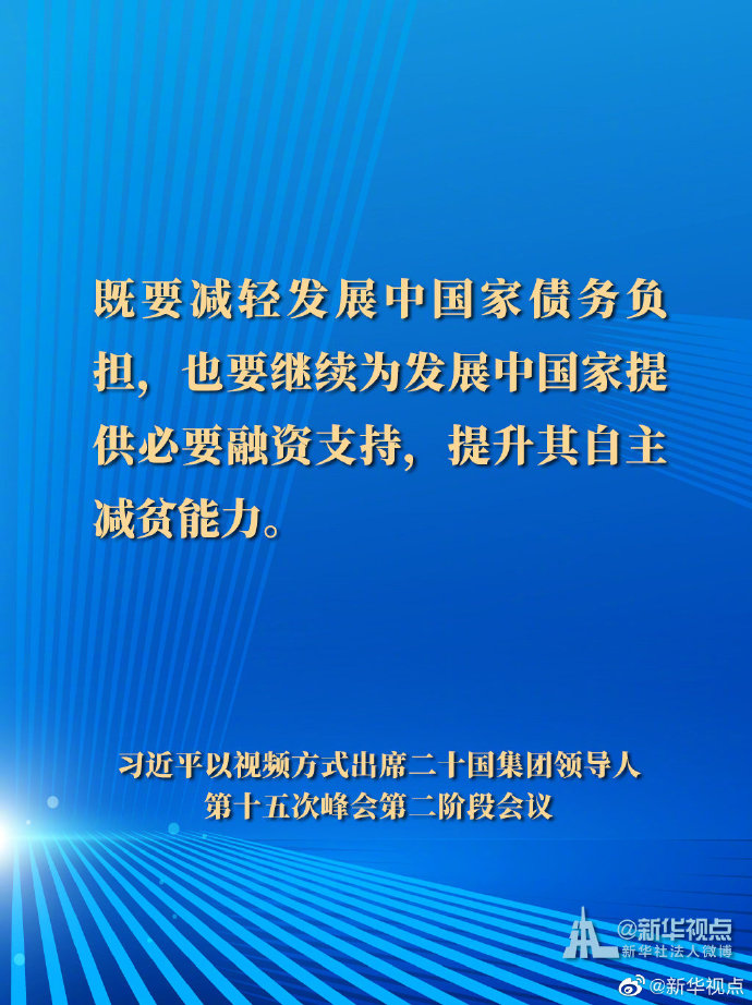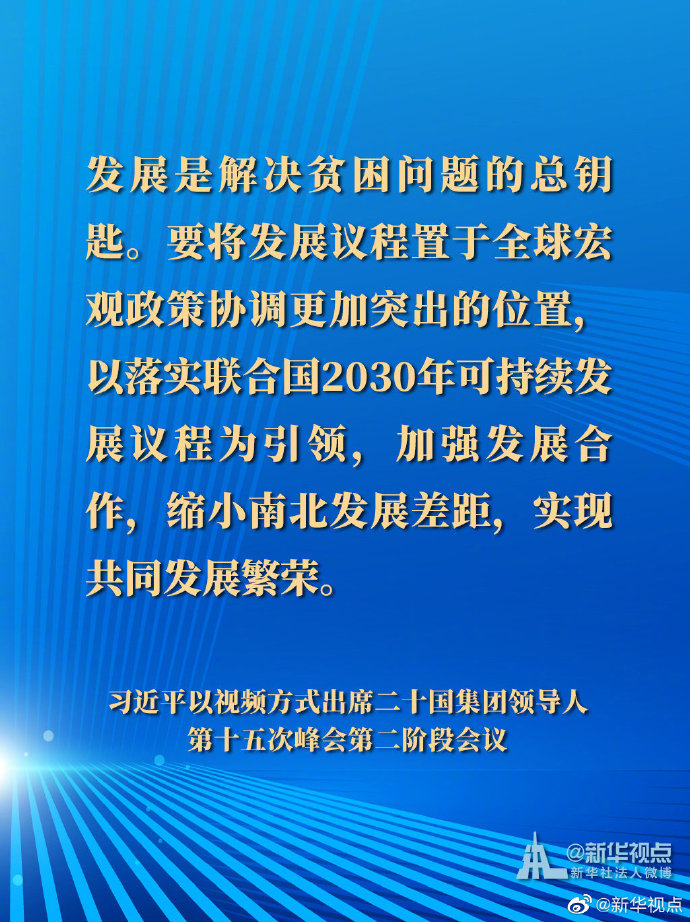 國家主席習近平11月22日晚在北京以視頻方式出席二十國集團領導人第十五次峰會第二階段會議。一起來看習主席的講話要點?